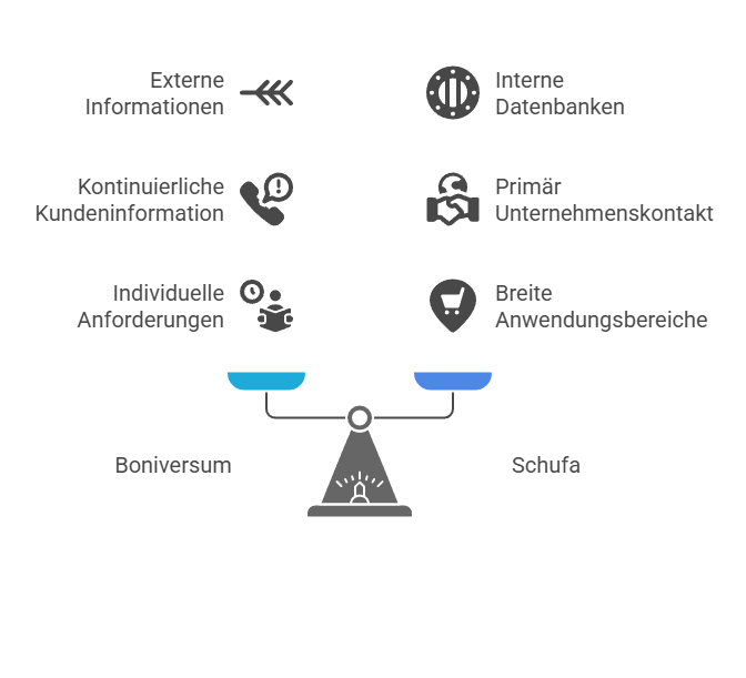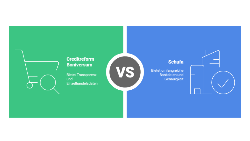 - Dateninhalte: Die Schufa-Auskunft zeigt verstärkt Bank- und Kreditinformationen, während Boniversum eher Verbraucherverhalten und Handelsdaten abbildet.