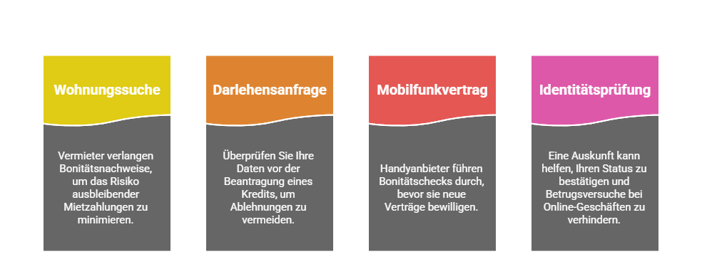 - Wohnungssuche: Viele Vermieter bestehen heutzutage auf frische Bonitätsnachweise, um das Risiko ausbleibender Mietzahlungen zu minimieren.